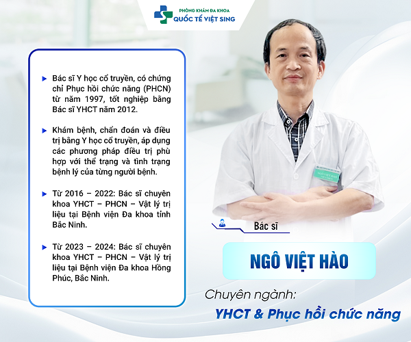 Bác sĩ Ngô Việt Hào được biết đến là bác sĩ chuyên khoa Đông y, dày dặn kinh nghiệm chuyên môn tại Phòng khám Đa khoa Quốc tế Việt Sing – Địa chỉ phòng khám Y học cổ truyền được đánh giá cao tại Bắc Ninh. Bác sĩ tham gia điều trị và phục hồi chức năng cho nhiều bệnh nhân mắc các bệnh lý xương khớp và thần kinh