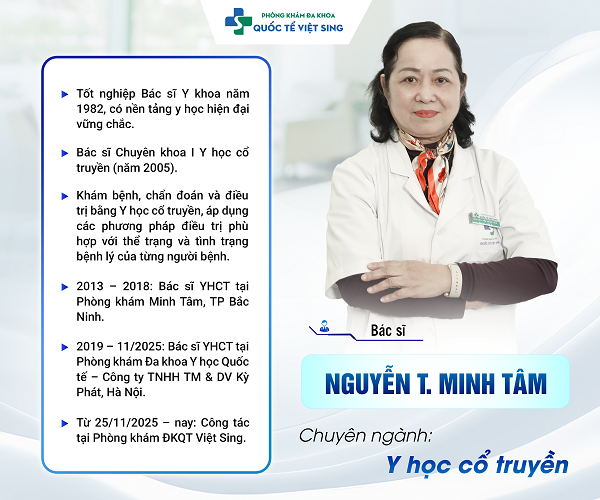 Với quá trình công tác dày dặn, bác sĩ Đông y – Nguyễn Thị Thanh Tâm đã tham gia khám và điều trị cho nhiều bệnh nhân mắc các bệnh lý đau cổ vai gáy, đau lưng, thoái hóa khớp và được đánh giá cao nhờ sự tận tâm và phương pháp điều trị phù hợp với từng bệnh nhân.