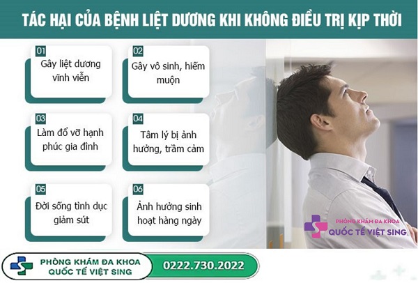 Việc chần chừ hoặc chủ quan không đi khám khi có dấu hiệu liệt dương có thể gây ra nhiều hệ lụy nghiêm trọng cho sức khỏe sinh lý, tinh thần và cả hạnh phúc gia đình. Dưới đây là những hậu quả thường gặp nếu bệnh không được điều trị kịp thời: