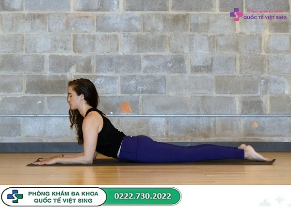 - Nằm sấp trên thảm, hai chân duỗi thẳng ra sau.